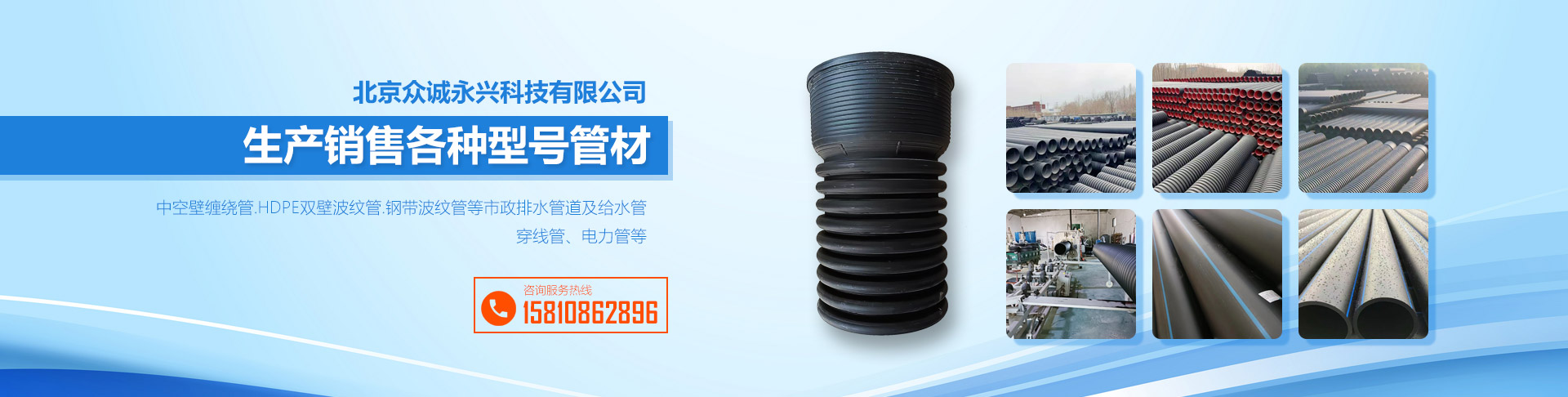 北京众诚永兴科技有限公司位于北京房山,本公司以生产销售中空壁缠绕管.HDPE双壁波纹管.钢带波纹管等市政排水管道及给水管、穿线管、电力管等各种型号管材为主。是一家拥有先进的技术设备,精确的检测系统,优质的产品质量,卓越的经营理念为一体的生产加工型企业。质量服务至上,用心服务每一位客户,是我们一直不变的宗旨。竭诚希望与您的合作。